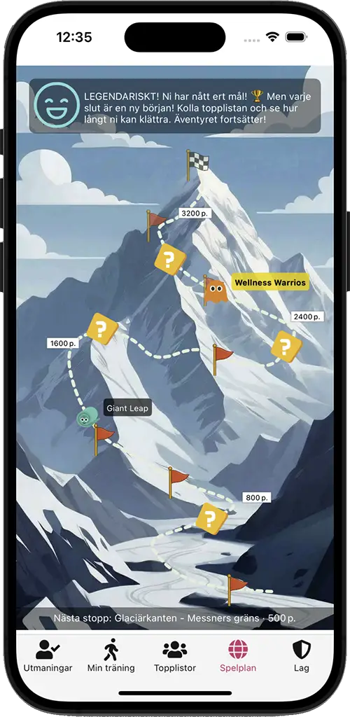 Ni siktar mot samma mål: att nå toppen av Mount Everest tillsammans. Men vägen dit ser olika ut för olika personer. Därför kan du samla poäng via fysisk aktivitet, återhämtning/stress, fokus och sömn – så att fler kan vara med, oavsett nivå och vardag.